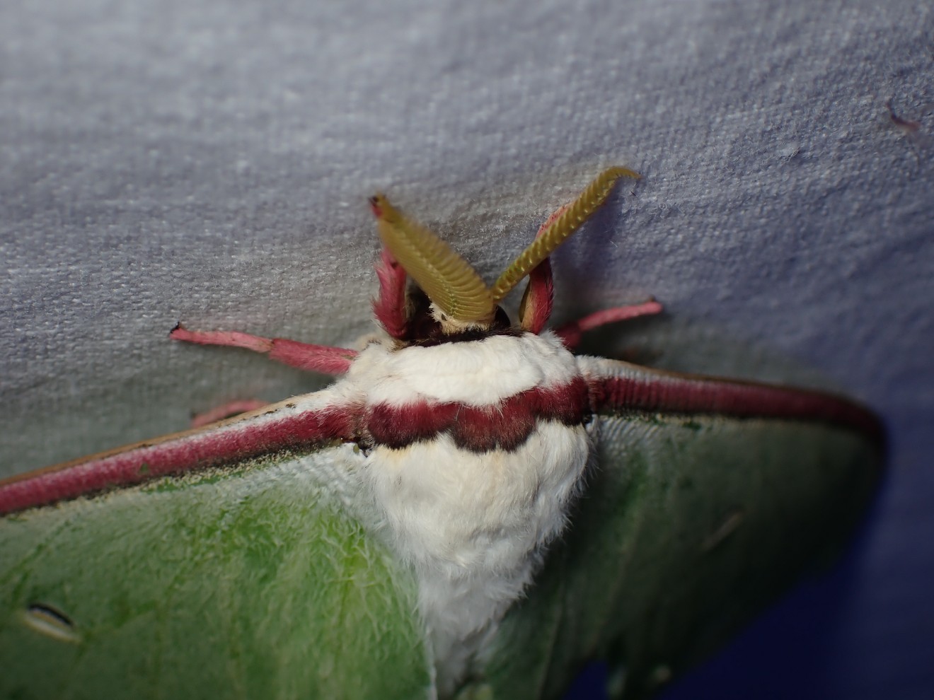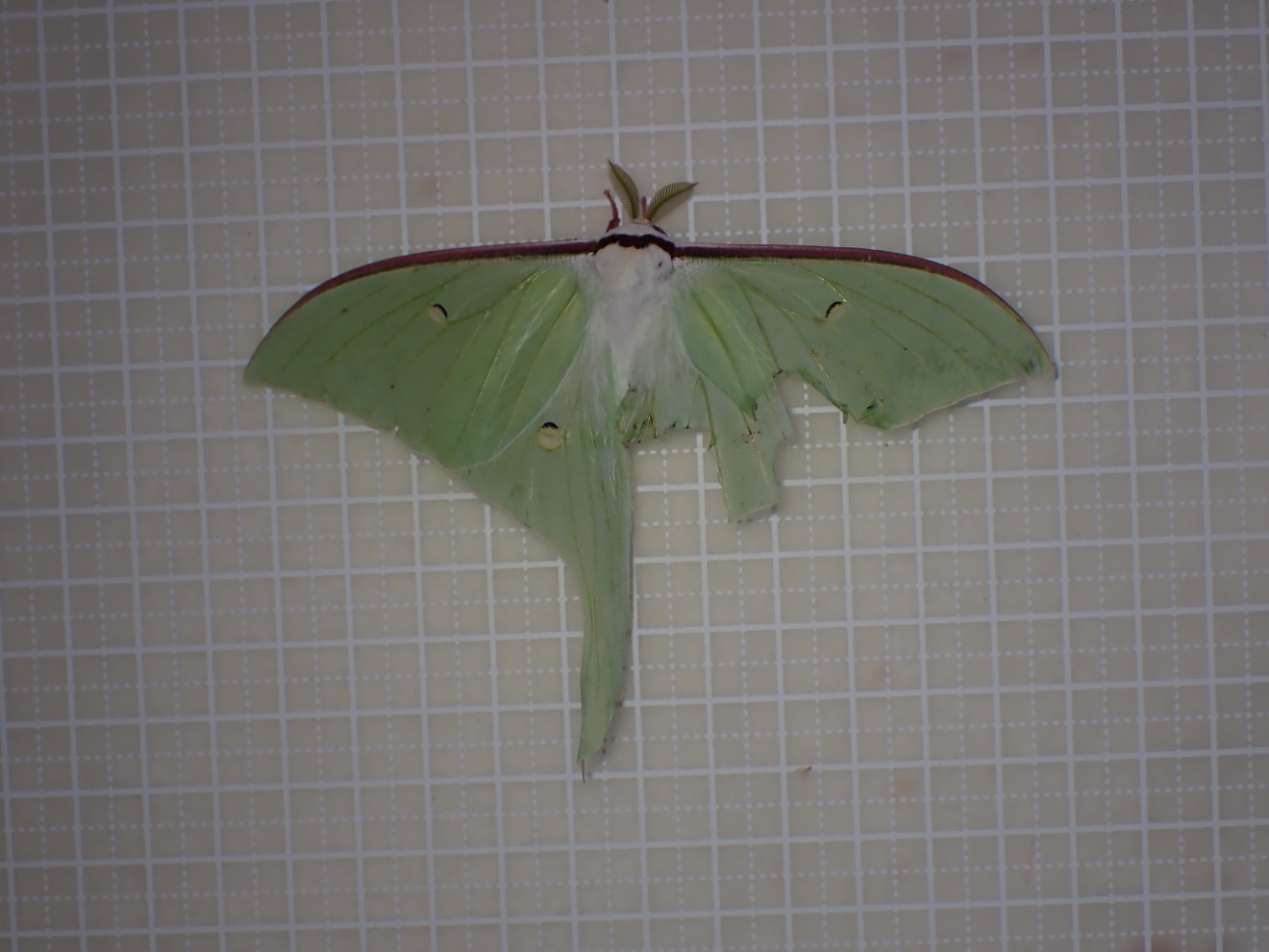 後翅が尖っている、眼状紋が大きい、前翅の前面が白い、触角が緑色(写真では分からりづらいですが)などの特徴があるのでオナガミズアオとして良さそうですね。ありがとうございます。