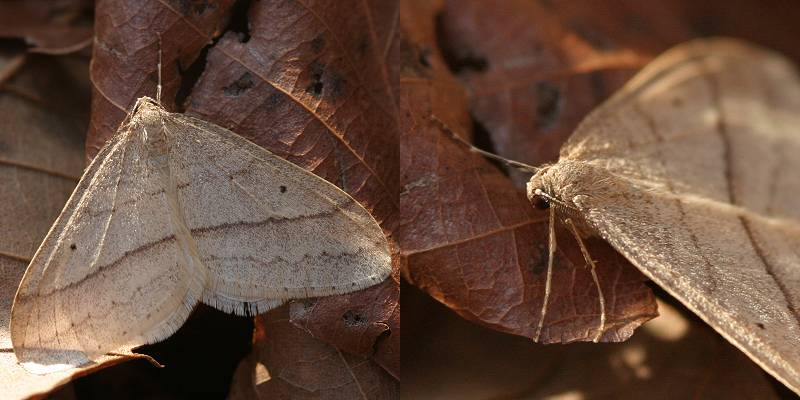 【掲示板から一言】 「冬尺蛾」。【成虫♀写真1】は1月4日 東京都瑞穂町 桜の木にて、体長7〜8o。【成虫♂写真2】と【成虫♂写真3】は同一個体表裏で、2005年1月9日、明石市(明石公園)。【成虫♀写真2】は2006年12月20日、東京都八王子。