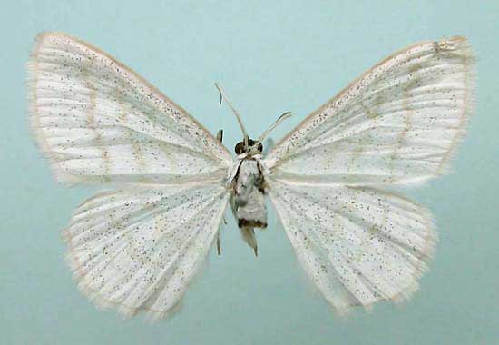 【掲示板から一言】 ウラテンシロヒメシャクに最も似る。本種の翅は純白、細かい黒色鱗をウラテンシロヒメシャクよりも多く散布する。横線は黄褐色で前翅に3本(内横線は弱い)、後翅に2本あり、ほぼ平行に走る。裏面にも黒色鱗をウラテンシロヒメシャクよりも多く散布し、横脈点は見られないか、時に後翅に弱く出るのみ。【成虫♂写真1】と【成虫♂写真2】は同一個体表裏で、6月中旬、旭川市内。【成虫♀写真1】は6月中旬、旭川市内。