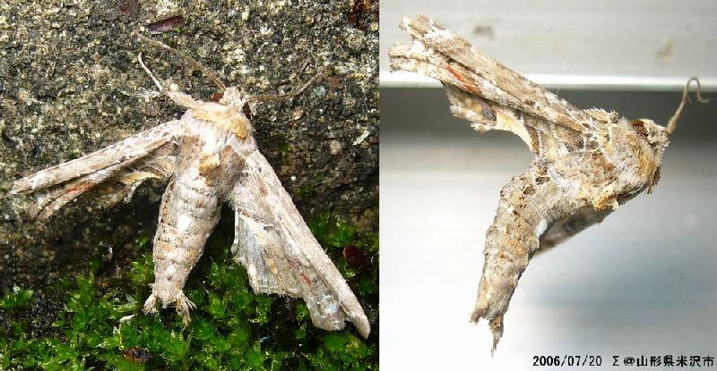 【掲示板から一言】 フサヤガに似るが、本種は、後翅の基半がほぼ白色で、♂の触角が鋸歯状、前翅長が15mmくらい。【成虫写真1】と【成虫写真2】は同一個体で、2002年8月、牛久市。【成虫♀写真1】と【成虫♀写真2】は同一個体表裏で、2004年11月28日、明石市(明石公園)。【成虫写真3】と【成虫写真4】は同一個体で、2005年7月15日、神奈川県海老名市。【成虫写真5】は2006年9月20日、埼玉県秩父市。