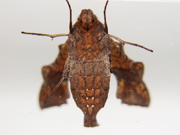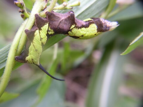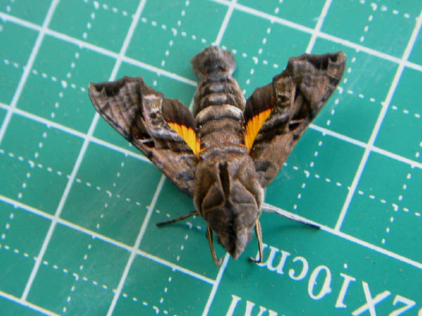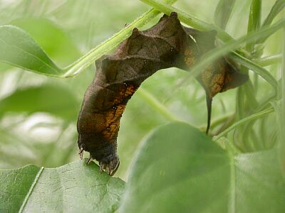 【掲示板から一言】 幼虫には紫色型、橙色型、緑色型、緑色無紋型の4種類がある。成虫は、後翅に黄色い模様があり、10円玉大の小型で、地色が焦げ茶色で、前翅後縁の湾曲が大きい。【成虫写真3】と【成虫写真4】は同一個体で、2004年6月4日、明石市明石公園にて。【成虫写真5】は2004年6月16日、和歌山県中辺路町にて。【成虫写真6】は2004年8月26日、富山県富山市布目。【成虫写真7】は2004年9月7日、八千代市黒沢池市民の森付近。【成虫写真8】は9月9日、東京都多摩市関戸。【成虫写真9】は2004年9月19日、千葉県中央区。【成虫写真10】は2004年9月26日、富山県富山市布目。【成虫♂写真1】は2004年9月25日、明石市(明石公園)。【成虫写真11】は2002年10月23日。【成虫写真12】は2004年10月6日、奈良市。【成虫写真13】は2004年11月4日羽化、さいたま市。【成虫写真14】は2003年8月9日、岡山県英田郡東粟倉村。【成虫写真16】は2005年7月17日、神戸市垂水区。【幼虫写真7】は右が終齢への脱皮が間近の4齢(ここまで体は白色)、右が紫型終齢に脱皮したばかりのもので、2005年7月10日、明石市(室内飼育)ヘクソカズラにて。【成虫写真17】は2005年10月3日、埼玉県熊谷市。【成虫♀写真1】-【成虫♀写真4】は同一個体で、2005年10月17日、富山県高岡市戸出。【成虫写真18】は2005年10月16日、呉市灰ヶ峰公園、ライトトラップに合計21頭集まった。成虫越冬するので冬にもまれに見かける。【成虫写真19】は2005年10月12日、愛媛県松山市。【成虫写真20】は10月26日、大阪市。【成虫写真21】は2005年10月14日、八千代市村上。【成虫写真22】は2005年10月31日、八千代市村上。【成虫写真23】は11月29日、長野県池田町鵜山。【成虫写真24】は6月24日、神戸市垂水区。【成虫写真25】と【成虫写真26】は7月14日、長野県池田町鵜山。【幼虫写真8】は2006年7月16日、東京都港区、自然教育園。【成虫写真27】は滋賀県高島市今津町。【成虫写真28】は2006年10月13日、宮崎県日向市の山間部。【成虫写真29】は2006年10月18日、長野県池田町。【成虫写真31】は11月16日、高知県室戸市の山間部にある小さな小学校の職員室の机の上。