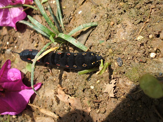 【掲示板から一言】 【成虫写真2】は2004年6月22日、明石市明石公園にて。【幼虫写真4】は2001年9月8日、富山県富山市布目 ホウセンカにてで、4齢。【幼虫写真5】は2001年9月24日、富山県富山市布目 ホウセンカにてで、終齢幼虫。【幼虫写真6】は2002年8月20日、富山県富山市布目 ホウセンカにてで、緑色型終齢幼虫。【成虫写真4】は2004年8月29日、東京都文京区。【幼虫写真7】は2005年5月24日、沖縄本島。【幼虫写真8】は2004年6月28日、神戸。【成虫写真5】は7月27日、兵庫県姫路市。【成虫写真6】は2005年8月12日、千葉市中央区。【成虫写真7】と【成虫写真8】は同一個体で、2005年8月11日、富山市(呉羽山)。【幼虫写真9】は9月16日、茨城県土浦市。【幼虫写真10】は9月24日、京都市伏見区。【成虫写真9】は2005年9月1日。【幼虫写真11】は2005年7月27日。【幼虫写真12】は2006年6月15日、沖縄本島、リュウキュウハンゲの葉。【成虫写真10】は2006年6月17日、千葉県八千代市村上。【成虫写真11】は岐阜県大垣市。【成虫写真12】は2006年7月21日、愛媛県松山市。【幼虫写真13】は2006年7月20日、大阪。【幼虫写真14】は2006年7月30日、徳島県鳴門市。【幼虫写真15】は2006年8月14日、埼玉県川口市。【幼虫写真16】は8月23日、和歌山県西牟婁郡白浜町。【成虫写真13】は千葉県茂原市。【幼虫写真17】は2006年9月6日、さいたま市。【幼虫写真18】は9月3日、群馬県渋川市。【幼虫写真20】は2006年9月11日、神奈川県綾瀬市小園。【幼虫写真21】は9月21日、福島県いわき市。【幼虫写真22】は八王子市。【幼虫写真24】は2006年10月7日、佐賀県。【成虫写真14】は2007年5月20日、愛知県瀬戸市萩山台。【成虫写真15】は2007年6月12日、愛知県知立市。