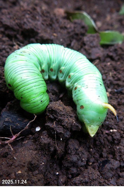 畑の土の表面で見た、おそらくスズメガ類の幼虫と思いますが、その名前が判りません。