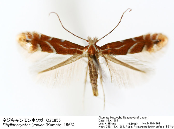 ネジキキンモンホソガ Phyllonorycter lyoniae (Kumata, 1963) Cat.855