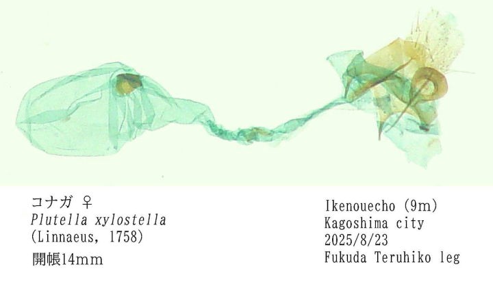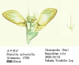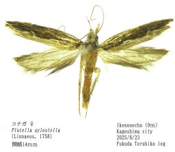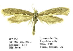開張12-15mm. ♂♀によって前翅の色が異なり♂は一見濃褐色, ♀は淡黄土色で時に帯灰色, そのため後縁上の帯白色の帯が暗色の♂では際立つ. その斑紋からdiamond-back mothと呼ばれる.害虫の1つでもあり, 翅脈, 後翅の脈M1とM2が長い共通の柄をもつのはPlutella 属の特徴である. |