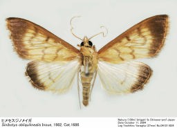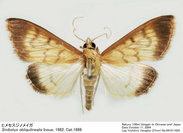 前種とごく近縁だが,翅の色が淡く,前翅外横線は前縁からやや外方に向かって走ったのち,M3-C・A1あたりでゆるやかに内方に走り,1A+2べで内方に鋭く角ばる.一方,前種では,この線は前縁からM3まで一直線をなし,中室下縁に沿って内方に走ったのち, やや外方に傾きながら後縁に至る.♂の前翅裏面基部近くで,中室の上下に鱗粉の束があり,下方の束は大きく,横脈上にも鱗粉塊がある.