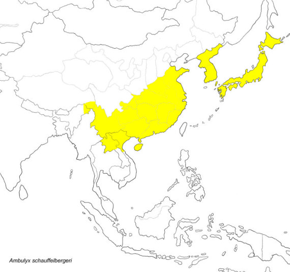 北東インド、中国、ラオス、北ベトナム、韓国、日本(北海道,本州, 四国,九州)