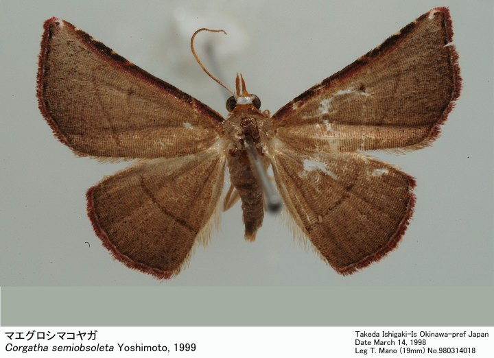 本種は西表島からCorgatha sp.として記録されたものと同じと思われる (佐藤・清野・内藤・藤巻,1978). 本種や近似のツマベニシマコヤガ及びフタスジシマコヤガでは♂交尾器にはほとんど違いが見られない. 強いて違いを挙げれば, harpeを基軸としたvalvaのプロポーションが異なるが, どの程度の個体変異があるのかは調べていない.