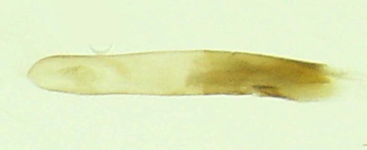 その途中から1本の長い刺毛を出す. 下唇鬚は長く鎌状に上反する. 地色は黒褐色で,