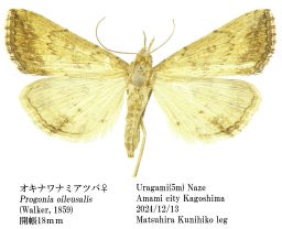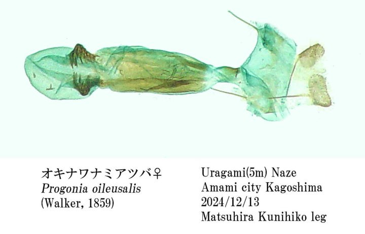 ♂の前脚の形態は同属のP.kurosawai オスグロナミアツバとともに P. mistacalis (Meyrick,1902)も同様であり (Robinson,1970), Progonia に固有の形態と考えられる. また, 後翅翅脈のRsとM1およびM3とCuA1は長い共通の柄を有する . 本種およびP.kurosawai の♀の交尾器のcorpus bursae 内には1対の数本の長い刺からなる特異な signaを有する.