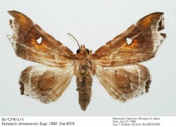 liturata (Fabricius), 台湾産の E. taiwana Wileman&West に近縁で, それらに酷似するが, 次の諸点で区別される. 開張はやや小さく, 29-37mm, 前翅の白色の腎状紋は円形に近く, 上端が小さく内方に切れ込むハ一ト形を呈する. 中室内には黒点を欠く. 腎状紋周辺の橙褐色影は周辺はぼやけて明瞭でない. その他 taiwana との斑紋の差異はほとんどない.
