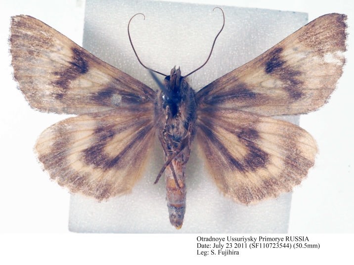 China, Japan (Hokkaido, Honshu, Shikoku) 沿海州, 朝鮮および日本に分布, 北海道および本州の内陸部に広く分布し, 近畿地方から中国地方に至り, 既知の最西産地は岡山県下にある. 一方四国では瀬戸内側に記録があるが, 稀少種となり, 九州からは未知. 一見垂直分布は広いが, むしろ中間帯2次林の蛾として把握されている. |
